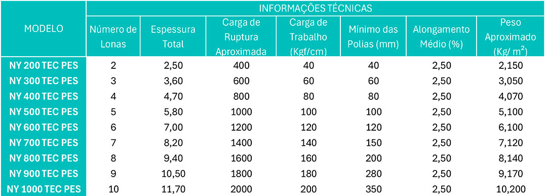 As correias NY TEC PES® são construídas por lonas de tecido técnico em Nylon com fibras de alta integridade termo unidas, podendo ser sobrepostas em múltiplas camadas. Sua trama incorpora fibras sintéticas de alta tenacidade resistentes ao encolhimento (super low shrinkage), que proporcionam maior estabilidade dimensional e preservam a largura original da correia mesmo em condições exigentes de operação. Possuem excelente flexibilidade, boa aderência, resistência à tração e absorção de impacto. Suportam cargas pesadas sem deformar.